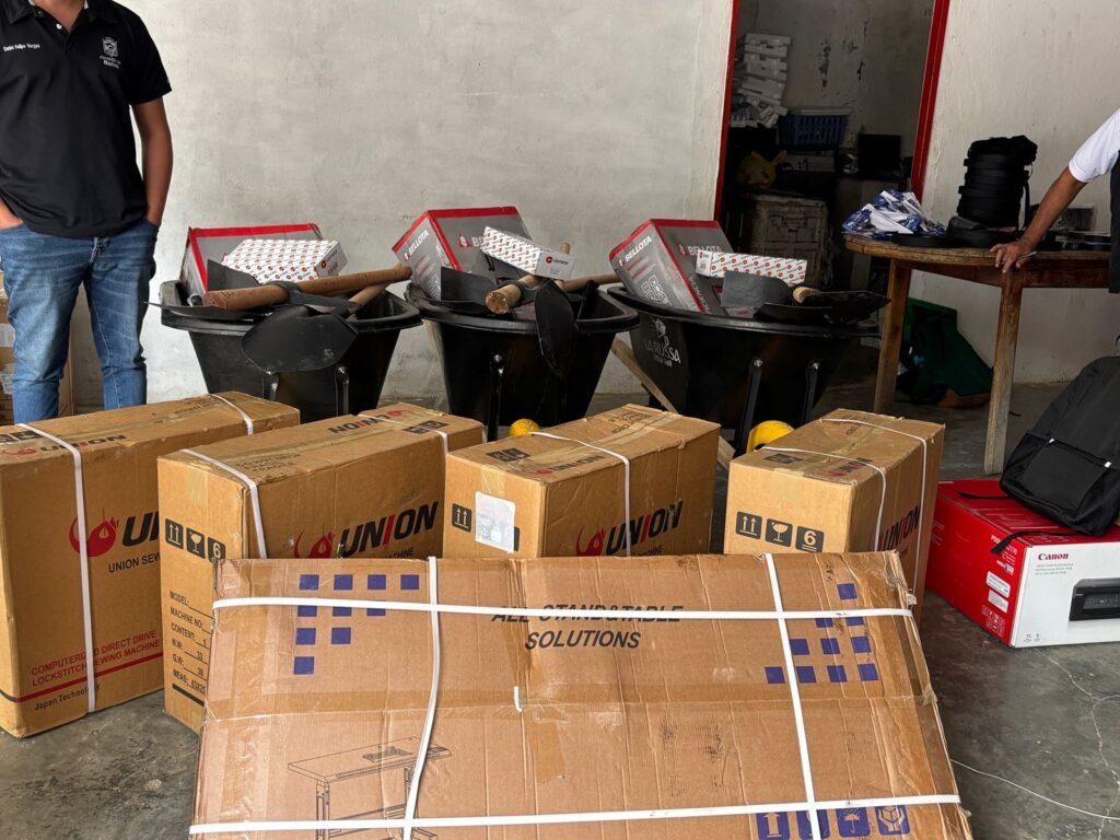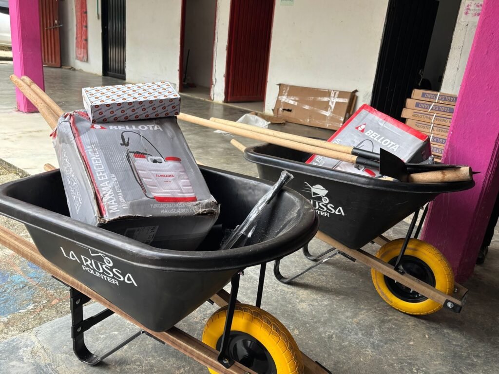 Entre los elementos entregados para apoyar la elaboración del sombrero de pindo se encuentran una máquina de coser eléctrica, tijeras multiuso, agujas familiares, fibra natural de pindo de ocho metros destinada a la elaboración de sombreros tradicionales, palines hoyadores, palas redondas con cabo de madera, tijeras podadoras y carretillas plásticas de 100 litros, utilizadas para el transporte de la fibra.